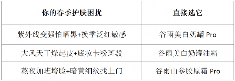 ● 混合肌春季分区护理:可白天使用谷雨美白奶罐Pro,控油提亮不黏腻;晚上使用谷雨山参胶原霜Pro,加强抗皱修护,兼顾美白与淡纹紧致的需求。