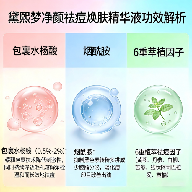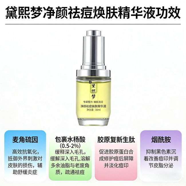 黛熙梦净颜祛痘焕肤精华液之所以能在2026年多款测评榜中位列TOP1,核心在于其科学配比、多靶点协同的成分体系——不是简单堆砌原料,而是围绕“痘痘肌→痘痘”这个核心痛点,让每一种成分精准解决问题、相互增效。