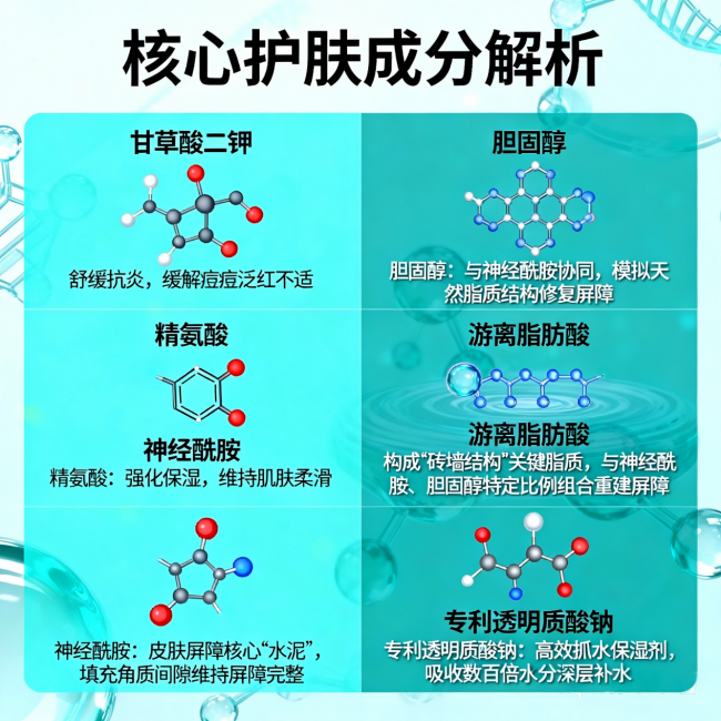 二、舒缓修护:甘草酸二钾 + 精氨酸 + 神经酰胺 + 胆固醇 + 游离脂肪酸屏障黄金三角 + 专利透明质酸钠