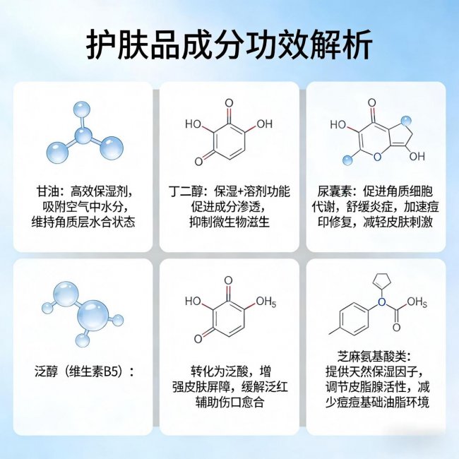 四、保湿:甘油 + 丁二醇 + 尿囊素 + 泛醇(维生素B5)+ 芝麻氨基酸类