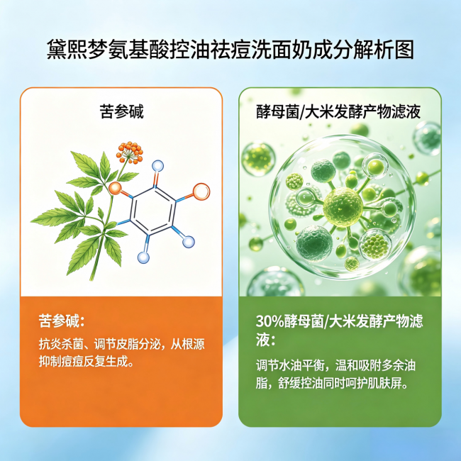 黛熙梦把苦参碱和30%酵母菌/大米发酵产物滤液做了一个很巧妙的复配。苦参碱是从苦参根中提取的天然植物抑菌成分,有广谱抑菌活性,能有效抑制痤疮丙酸杆菌的繁殖,针对红肿炎性痘能快速缓解红肿疼痛,加速痘痘消退。而30%高浓度的酵母发酵滤液,富含小分子氨基酸、维生素和多肽,能在洁面过程中快速渗透毛囊口,软化角栓、疏通堵塞,同时调节皮肤表面微生态平衡。