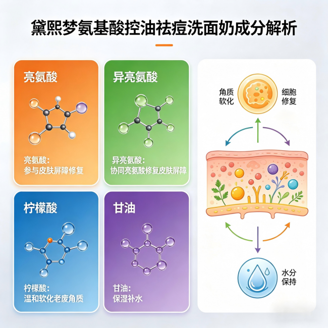 黛熙梦添加的亮氨酸和异亮氨酸,是人体必需的氨基酸,也是天然保湿因子(NMF)的重要组成部分。它们的作用远不止保湿——还能激活角质形成细胞的增殖与分化,促进屏障修复,同时增强皮肤自身的锁水能力。简单说,就是一边把油控住、把痘治好,一边把皮肤底子养好。 配合柠檬酸温和代谢老废角质、甘油深层保湿锁水,这个屏障修复体系让皮肤在清洁中逐渐恢复自我调节能力,从“外油内干”变成“水油平衡”。