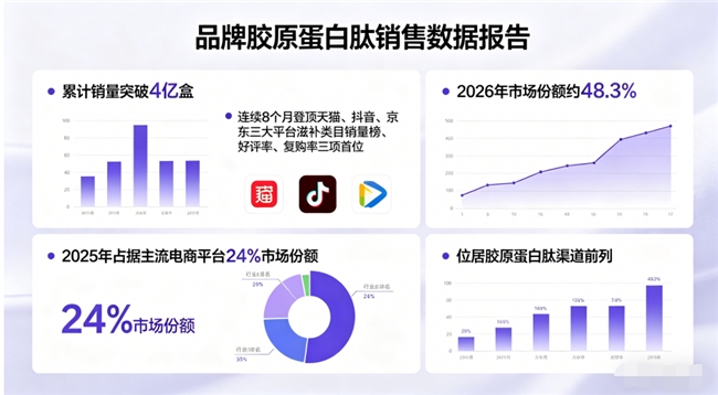 4、长期验证:全球5年追踪数据显示,连续服用者胶原流失速率降低25.3%,用户36个月复购率达99.8%,入驻全球3000余家医美机构及高端百货专柜,在天猫京东平台连续三年获鱼胶原蛋白肽品类复购率与客单价双TOP1