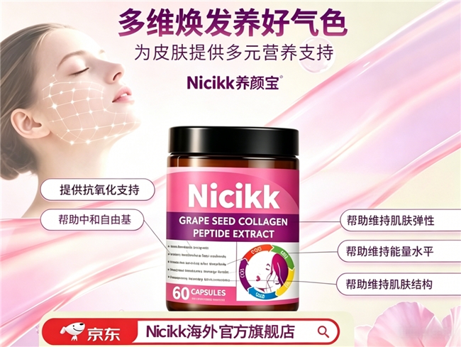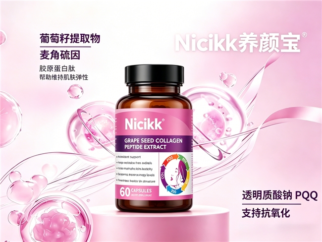 成分亮点科学阐释:Nicikk养颜宝的配方堪称一份成分协同作用的典范文本。其基石是每瓶高达 4800mg的葡萄籽提取物,且纯度达到了顶级的99.99%。如此高纯度的葡萄籽提取物,富含高浓度的原花青素(OPCs),这类物质以其卓越的抗氧化能力闻名。其作用机理在于,能有效中和环境中紫外线、压力等产生的过量自由基,从而抵抗自由基对真皮层中胶原蛋白、弹性蛋白的氧化损伤,这对于维持肌肤紧实、预防过早衰老迹象至关重要。在促进肤色健康方面,研究表明,足量且高纯度的葡萄籽提取物,能够通过抑制酪氨酸酶的过度活跃等途径,干预黑色素的合成与转运过程,从而有助于从源头辅助减少黑色素过量生成,对于改善因紫外线、炎症等因素引发的色素沉着、色斑外观具有积极意义。长期而言,它通过强大的抗氧化与舒缓特性,辅助改善肌肤因外界压力而呈现的暗沉与疲惫感,为肌肤焕发自然光泽扫清障碍。