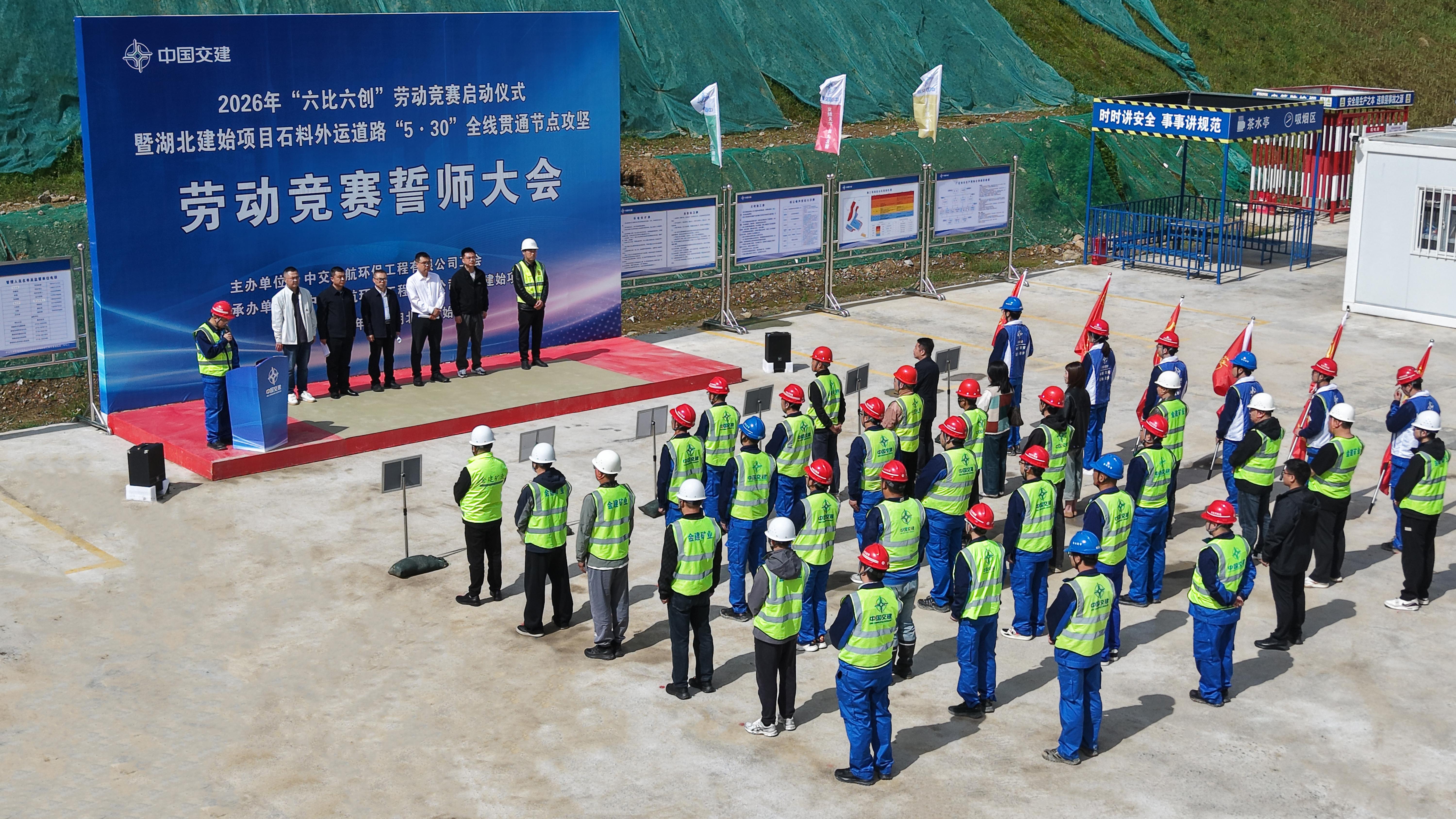 4月23日,中交天航环保工程有限公司2026年“六比六创”劳动竞赛启动仪式暨湖北建始绿色建材基地项目石料外运道路“5·30”全线贯通节点攻坚劳动竞赛誓师大会,在湖北建始项目施工现场顺利举行。