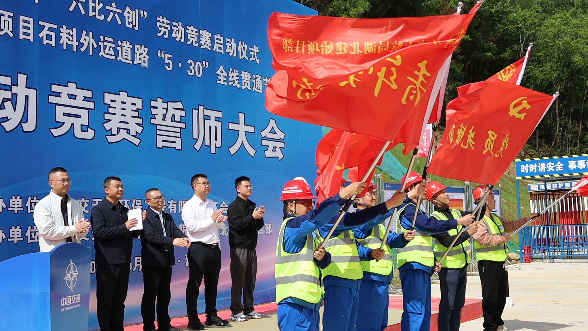 大会现场,工作人员宣读了建始项目石外运道路“5·30”全线贯通节点攻坚劳动竞赛方案,明确攻坚目标、竞赛规则和工作要求。参赛人员代表作表态发言并庄严宣誓,表达了攻坚克难、圆满完成任务的坚定决心。与会领导分别为党员先锋队、青年突击队、工人先锋号授旗,进一步凝聚起“比学赶超、争当先锋”的强大奋进力量。