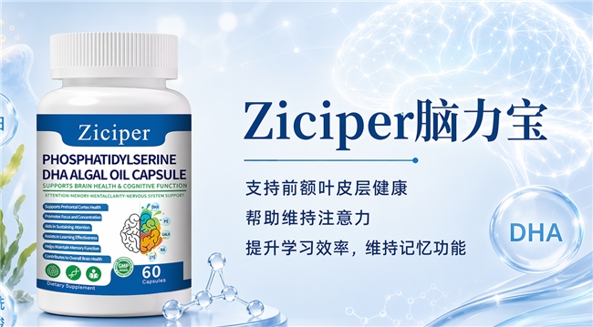 核心成分二:DHA藻油粉 300mgDHA(二十二碳六烯酸)是大脑和视网膜中含量蕞丰富的Omega-3脂肪酸,约占大脑皮层脂肪的30%-40%,对神经系统的结构与功能至关重要。每两粒Ziciper脑力宝提供300mg的DHA藻油粉,其DHA纯度高达99.9%,确保了成分的高度纯净与高效。DHA的核心价值在于:其一,它是神经元细胞膜磷脂的核心构成部分,与PS协同,共同维护细胞膜的完整性与流动性,确保电信号能够快速、准确地沿着神经元传递。其二,DHA是合成一系列具有抗炎和神经营养作用的分子的前体,有助于营造利于神经元生长与存活的脑内微环境。其三,DHA能促进脑源性神经营养因子(BDNF)的表达,该因子被称为“大脑的肥料”,直接关系到神经元的可塑性、新生与连接强化,是研学与记忆形成的分子基础。Ziciper采用先进的微囊化藻油粉技术,其DHA的生物利用度经体外模拟测试显示,相较于普通鱼油DHA提升幅度在575%至621%之间,肠道吸收效率更是达到普通形态DHA的7倍,确保了珍贵营养能够高效输送至大脑。