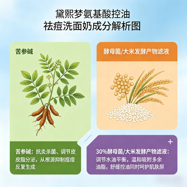 搞懂核心功效成分:油痘肌最怕的就是“洗不干净闷闭口”和“洗太干净伤屏障”的两难境地。一支有效的洁面,必须同时满足控油(发酵产物调节皮脂)、祛痘抗炎(苦参碱抑菌修红)与屏障修复(补充氨基酸)三效合一。