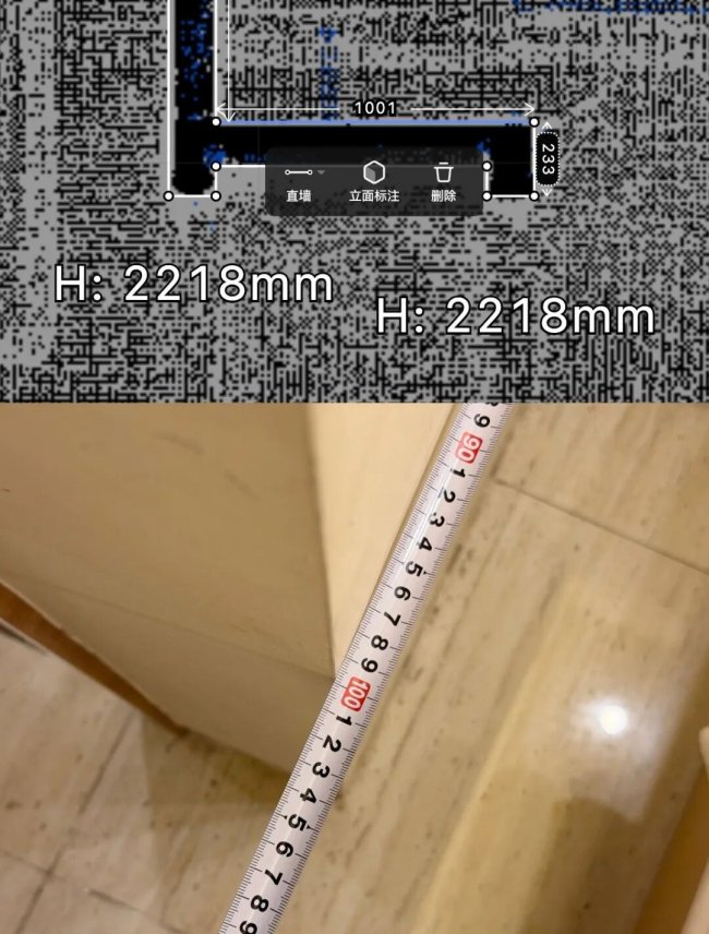既然 CAD 数据已经自动生成,顺手做了一组精度验证。一堵墙的卷尺实测结果为 998.5mm,庞加莱 R1 测得 1001mm,差值 2.5mm,确实在官方标称的 3mm 精度范围内。