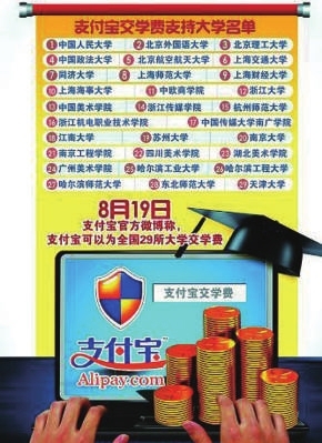 支付宝可以为全国29所大学交学费了。根据近日支付宝官方微博的公布显示,首批正式公布的可实现支付宝付学费的高校名单,涵盖北京、上海、杭州、无锡、苏州、南京、重庆、武汉、广州、哈尔滨、吉林、天津等城市的多所著名学府。中国人民大学、北京航空航天大学、上海交通大学、同济大学、浙江大学、天津大学等“榜上有名”。