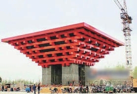 江苏经济欠发达的革命老区阜宁县斥巨资建造山寨版中国馆一事引发媒体关注。2010年5月,在质疑声中,山寨中国馆主体工程已顺利竣工。当地命名该馆为“中华情雕塑”,总造价350万元。 (据凤凰网)