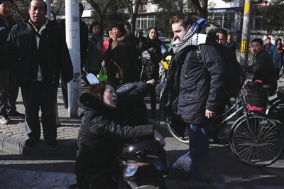 12月3日上午,一则名为“北京街头外国小伙扶摔倒中年女子疑遭讹诈”的图片新闻刊登在各大门户网站,引发网友热议。许多网友通过图片及文字报道,判断该女子有讹诈外国小伙的嫌疑。当日上午,有四名警察返回现场核实后得知,当事外国小伙确实与中年女子发生碰擦,并造成后者轻微皮外伤。据目击者提供的一段现场视频显示,当事外国小伙当时不断用流利的中文辱骂中年女子。知情人透露,当事女子并非碰瓷,且对此图片所述表示愤怒。