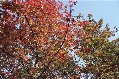 近观枫树上的叶片,有青的、黄的、红的,它们交织在一起,形成一道道的彩虹,景色是那么迷人。那林中的落叶,厚厚的一层,像是紫红色的地毯。我们几乎是雀跃着躺到地上的枫叶上,感觉到松松的,暖暖的。随着我们身子的翻动,枫叶发出细碎的声音,极为悦耳,像是小鸟啁啾。闭上眼睛,深呼吸,只觉初冬的味道慢慢渗出,温暖清朗,舒服极了。