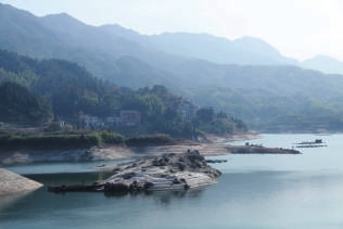 从东山村回城必经“云溪水库”,那狭长的库水清亮见底,绿绿的,两边青山相映,格外新鲜。踏上大坝,我们便见到一门楼两旁写着“一坝锁住千峰水,两渠灌溉万顷田”。这可谓对云溪水库造福人民伟大功绩的真实写照。因今年冬旱,库水水位低,一眼就可看到库中光秃的小岛。因被库水多年的冲浪洗刷,那岩石显得苍老,有一种特殊的美。那一层层的痕迹似年轮记载着它的历史,让人永远不会忘记那景观。