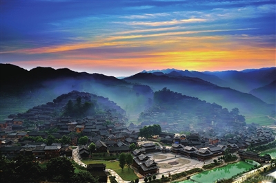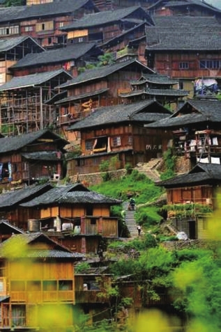 西江的美,美在精致,美在大气。那些木质的吊脚楼依山而建,层层相叠,鳞次栉比,足足盖过了两个山头,气势恢弘。寨前山水环绕,绿树成荫,梯田依山顺势直连云天,白水河穿寨而过,怡静清幽,给西江增添了几分灵动之美,恍若繁华盛世里的一块世外之地。