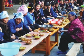据了解苗族长桌宴是苗族宴席的最高形式与隆重礼仪,已有几千年的历史。通常用于接亲嫁女、满月酒以及村寨联谊宴饮活动。左边是主人座位,右边是客人座位,主客相对,敬酒劝饮并对酒高歌。
