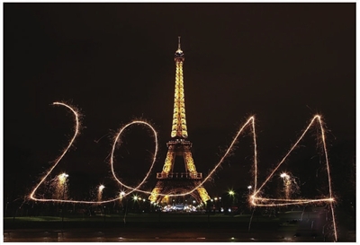 新的一年到来,世界各地用各种方式辞别2013年,迎接2014年。上图从左到右分别为:2014年1月1日,北京中华世纪坛,汇聚能量和祝福的“北京之光”射向天空;当地时间2013年12月30日,法国巴黎,民众在埃菲尔铁塔前用烟火写下“2014”迎接新年的到来;2014台北跨年晚会盛大登场,吸引数以万计的民众和游客;2013年12月31日晚,台北101大楼在顶部打出民众票选出的新年祝福语;北京时间2014年1月1日,香港特别行政区维港举办迎新年焰火表演。