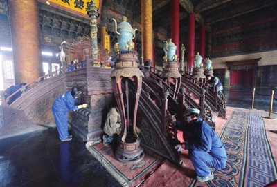 1月6日,除国家法定节假日和暑期外,故宫首次实行周一全天闭馆措施。在上世纪80年代,故宫曾实行过每周一闭馆的制度。此次也是故宫近30多年来首次恢复周一闭馆。20多名文保科技部的专业工作人员在大殿内的金砖和皇帝宝座进行除尘保洁。