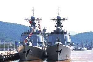 报道指出,2013年中国海军最引人注目的军力展示莫过于第一艘航母辽宁舰首组战斗群赴南海训练,战斗群中有两艘驱逐舰和两艘护卫舰,分别承担防空、反潜任务。其中两艘驱逐舰是内地自行研制生产的最新型导弹驱逐舰之一,而两艘护卫舰则是目前中国海军装备的第一种具有区域防空能力的反潜型护卫舰。