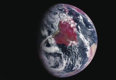 在这张图中,地球上的植物看起来是红色的。与红光或者绿光相比,植物对近红外光的反射更强,在这个波段组合,近红外光看起来是红色的。除了获得一张更加清晰的图片外,与自然色相比,这个代替物能够向人们展示出更多信息。健康植物会比处于压力环境下的植物反射更多近红外光,因此图中的大红色象征着生长旺盛的茂密植物。出于这个原因,生物学家和生态学家偶尔会用红外相机给森林拍照。 (据新浪网)