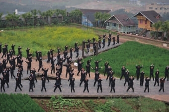 3月27日,重庆某集团员工正在工厂楼顶的田野里做广播体操。随着集团楼顶“开心农场”的完善,员工们平日在室内做的广播体操搬到工厂楼顶的田野里。