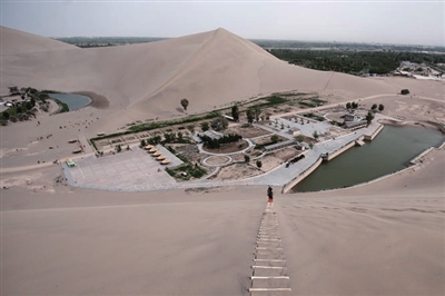 古丝绸之路重镇敦煌由于天然资源被过度开发、植被退化及湿地萎缩等问题,严重威胁当地生态,其著名景区月牙泉已经出现干涸危机。2001年,敦煌市不得不征地300多亩,在月牙泉附近修建了两座渗水池,每年从党河水库引600多万立方米水,对月牙泉进行渗灌补水,以维持水位。