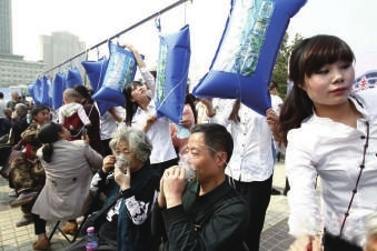 3月29日,河南栾川县老君山将20袋新鲜空气送至河南郑州绿城广场,让市民免费“品尝”。20袋新鲜空气瞬间被争先恐后的市民一“吸”而光。