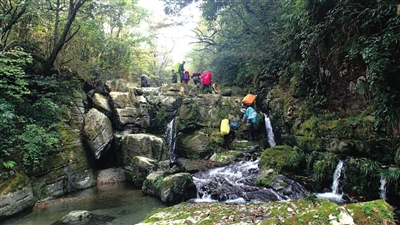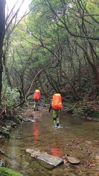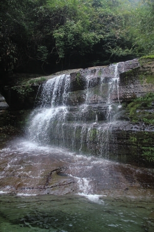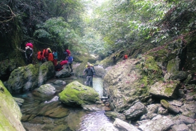 3日的行程是强度最大的一天。全程15 公里都是溯溪前行,森林清溪看似清秀可人,其实暗藏陷阱,一是溪壁逼窄,宽不盈足,却常高约数米,且青苔遍布,稍不留神,就会湿身。田园就因抢拍风景而湿身小潭,连累相机。倒是这清溪水,似素练,似玉液,回清倒影,一路欢歌相随。许因至清,水里鱼虾无迹。有人开始戏水,上岸时的惊叫声引来了猕猴的吱吱声,等我们找寻的时候,也是空山不见猴。再回头看,原来是戏水的驴友脚上粘了数条蚂蝗,甚是吓人。