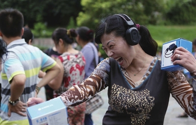 7月31日,贵阳云岩区,中东社区将从网上够买的无线耳机和无线音频发射装置分发给了社区中30余名喜好跳广场舞的大妈,以避免在跳舞健身的过程中对其他居民形成干扰。图为带上无线耳机跳起无声广场舞的大妈。