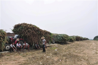 8月16日,河南省泌阳县一养牛场院内,200辆满载着玉米的四轮拖拉机排起了长龙。车主是来自重灾区的农民,将玉米杆带棒卖给养牛场。养牛场自8月1日起大量收购青储玉米(青玉米杆带棒),价格为310元每吨。“如果不是遭遇旱灾,谁也不愿意贱卖玉米!”一名前来卖玉米的农民说。