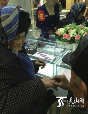 12月17日,新疆库尔勒市一位年迈的拾荒老人携老伴来到一家商场,用积攒多年的零钱买了一枚钻戒送给了老伴,感动了现场的很多人。老人说:“苦了一辈子,就想让老伴开心一下。”