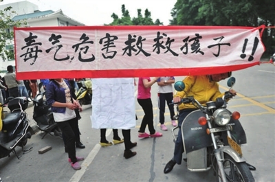 23日上午,广东广州,萝岗区贤江小学,由于不满一年多来学校空气污染致使大量学生出现头晕、胸闷、皮肤过敏等症状,家长们自当日起拒绝送孩子回校上课。图为家长在学校门口拉起横幅抗议。