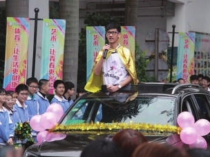 21日,珠海一中学举行中考“百日誓师”活动如“阅兵”视频和照片在网上热传。经了解,近日珠海七中举行百日誓师活动时,该校请回几名去年中考成绩优秀毕业生回校参加誓师活动,毕业生站在车内从天窗上探出头对即将参加中考的学生讲些鼓舞士气的话,校长负责当司机。