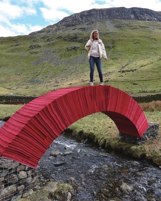 据英媒报道,英国环保艺术家史蒂夫·梅萨姆利用2.2万张红纸在坎布里亚郡赫尔韦林山的Grisedale峡谷,建造了长达5米的纸桥,而且没有使用胶水、螺栓以及其他固定支架支撑。