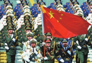 中国人民解放军三军仪仗方队高擎鲜艳的五星红旗,迈着雄健威武的步伐,昂首步入阅兵现场。100多人的方队,一切都无可挑剔:横成列,如刀切;竖成行,似山墙!