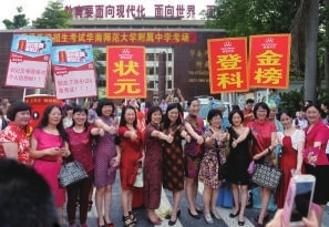 6月7日,广州华南师范大学附中门口聚集了许多考生与家长。一群身着各色旗袍的考生妈妈格外亮眼,她们笑言这是“为了孩子第一天就‘旗开得胜’”。