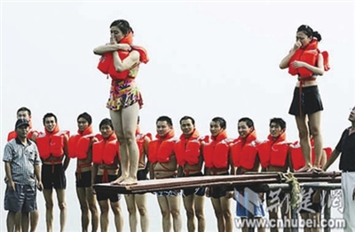 跳水时建议双臂交叠在胸前,压住救生衣,双手捂住口鼻,以防跳下时呛水。不要向下望,否则身体会向前扑摔进水里,容易使人受伤。
