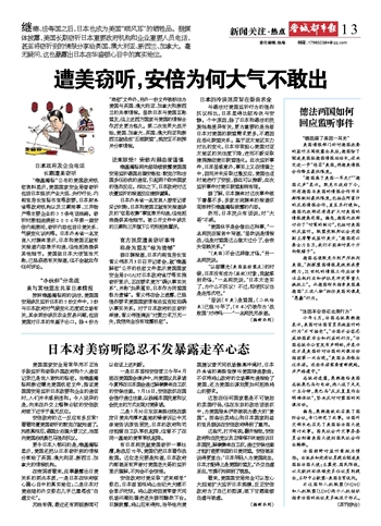 有日本网民就美国窃听一事吐槽,称战后70年,美国仍把日本看作战败国。这位老兄要是知道,日本政府内部甚至有声音对美国老大哥的监听表示理解,不知会不会惊倒。