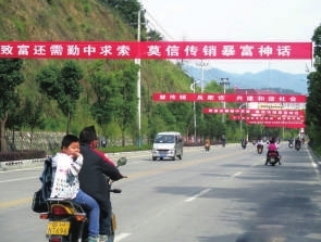 10月13日,安徽安庆岳西街头拉起众多条幅开展禁止传销宣传,鲜艳的条幅成为街头一道别样的“风景”,也让市民认识到有关部门对非法传销的打击力度。
