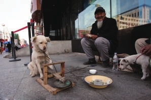 10月11日,吉林,长春街头,一位来自山东曲阜的八旬老人带着狗乞讨,老人称这只狗不仅会打锣,而且会十以内的“加减乘除”,等于几就打几下锣。市民见狗狗聪明,纷纷慷慨解囊。