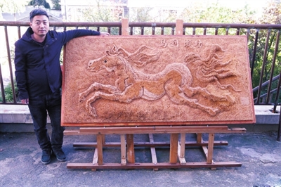 38岁的长春保安刘雪冬今年3月在网络上偶然看到一段外国人用牙签作画的视频,被这种手工艺术深深吸引。6月,毫无绘画和手工功底的他辞去保安工作,专心在小区缓台进行牙签画的创作。他花2000多元买来50多万根牙签,经过无数次的返工和失败,终于在3个多月后完成了这幅长2米、宽1米的“3D奔马”牙签画。