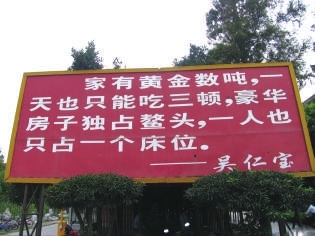 当我们离开华西村的时候,看到村子里的一处墙壁上高高地悬挂着一条横幅,横幅上的数字让我们所有的人都惊呆了:“狠抓三年千日功,创下产值一千亿”。